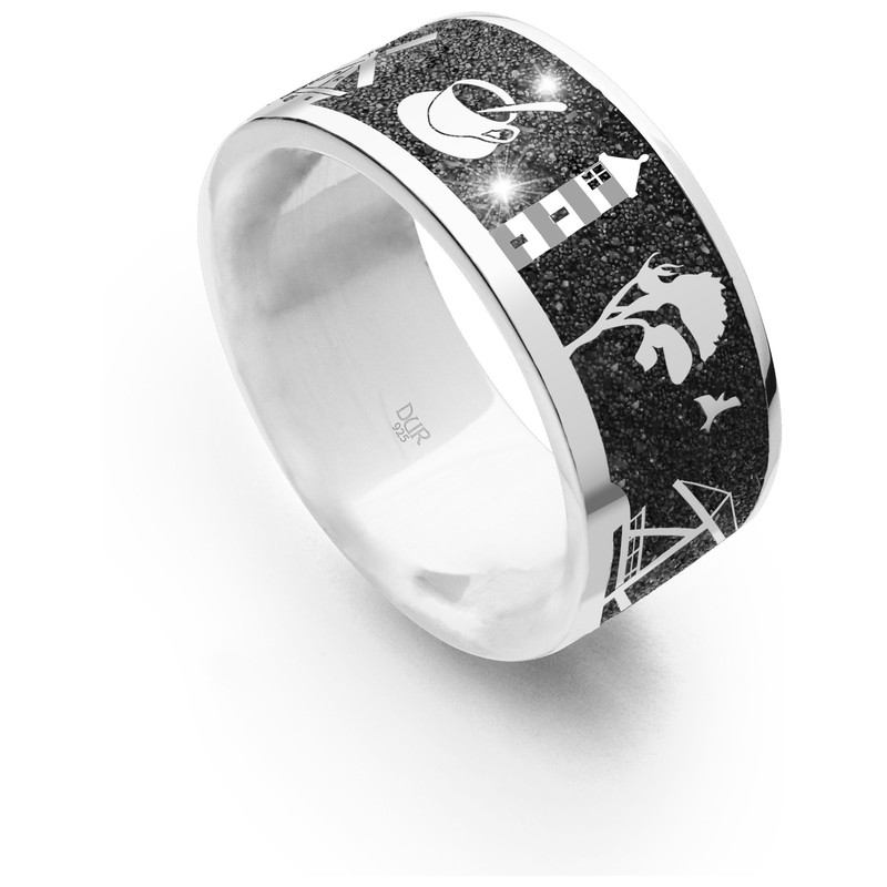 Nachtring „Ostfriesland“ mit den Motiven,Kuh (Wittmund, Windmühle (Aurich), Teetasse (Leer), Leuchtturm (Pewsum), Windflüchter (Norden), Möwe (Nordsee), Fehnbrücke (Wiesmoor), eingebettet in Lavasand und gefasst in rhodiniertem 925er Sterling-Silber.