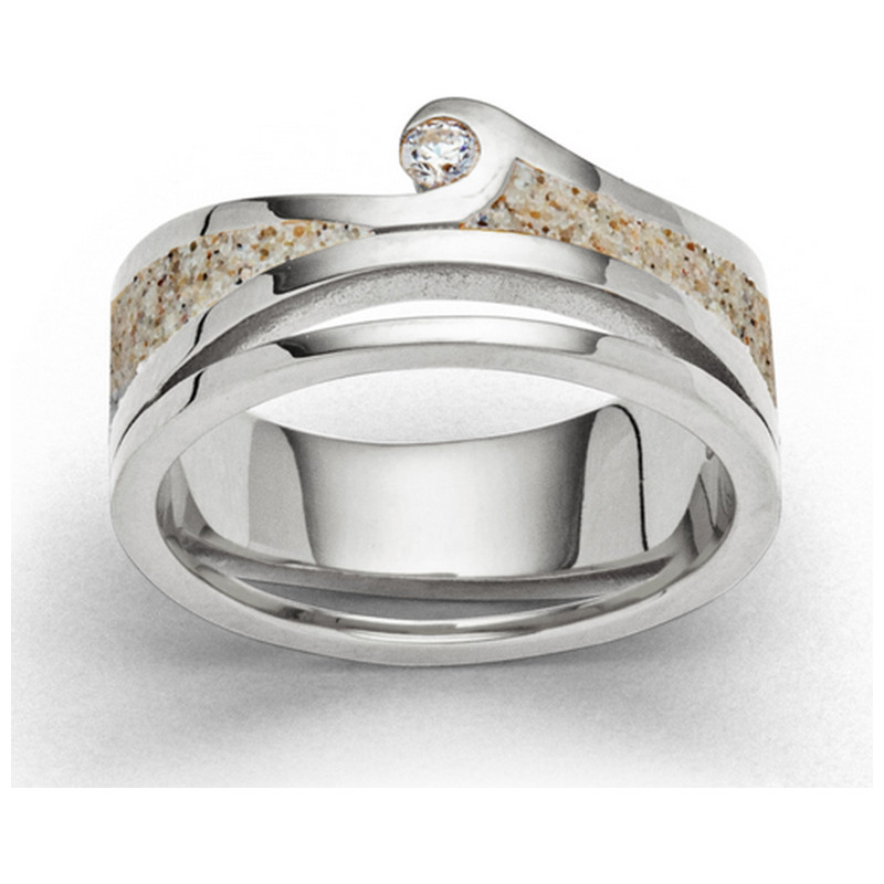 Der Ring „Maui“ vereint kraftvolles Design mit natürlicher Schönheit. Auf 10 mm Breite zeigt eine filigrane Welle ihre Bewegung, gefüllt mit echtem Strandsand, während ein 2,5 mm Zirkonia für ein dezentes Funkeln sorgt.