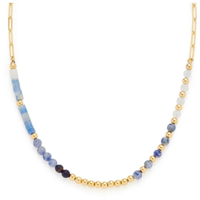Die zarten Natursteine zeigen sich in einem sanften Verlauf von weiß zu blau. In der Kombination mit poliertem Gold erhält die Kette einen modernen Kontrast, der mit der Paperclip-Kette schön unterstrichen wird. Diese Kette schafft eine perfekte Bala