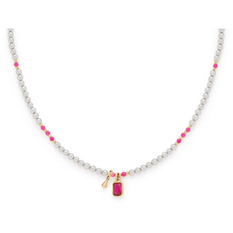 Diese Kette vereint zarte Details mit kräftigen Akzenten. Kleine Imitationsperlen in Hellgrau harmonieren perfekt mit filigranen Goldkugeln und lebhaften Glasperlen in strahlendem Pink. Ein besonderer Hingucker ist der pinke Baguettestein in der Mitt