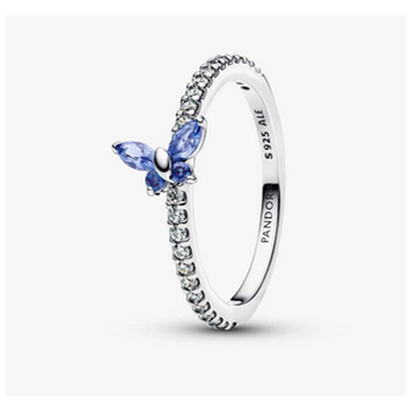 Verleihe deinem Look dezenten Glanz. Dieser Ring aus Sterling-Silber hat blaue und klare Cubic Zirkonia mit einem Schmetterling in einer schrägen Fassung als Symbol für Verwandlung und Schönheit.