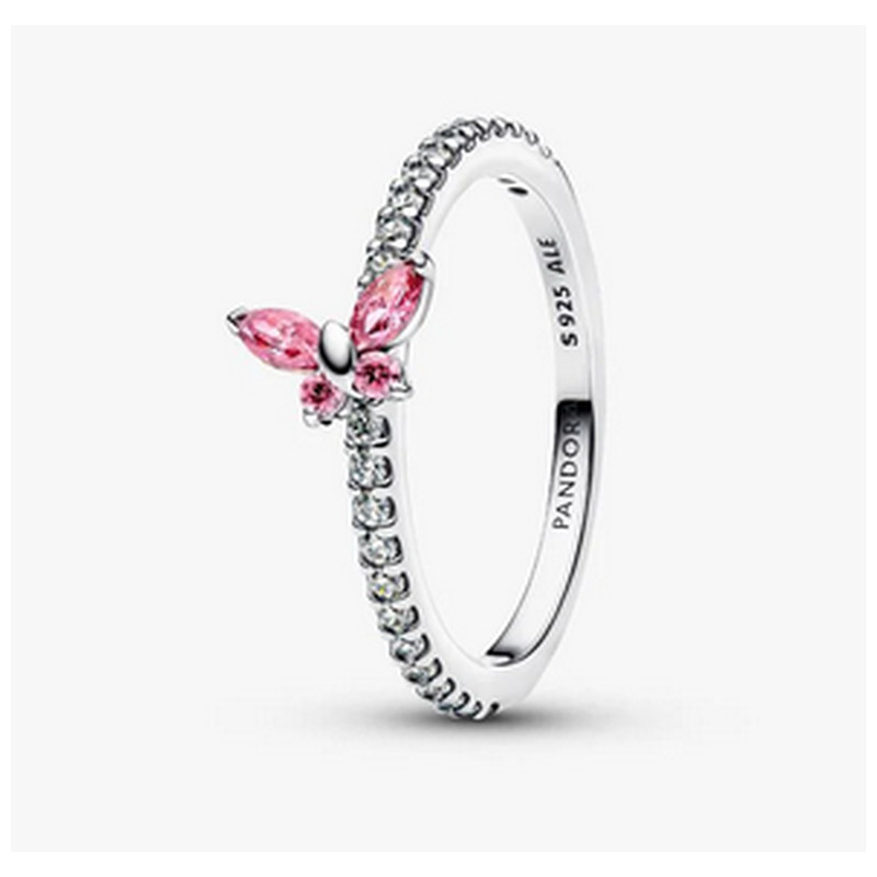 Verleihe deinem Look dezenten Glanz. Dieser Ring aus Sterling-Silber ist mit rosafarbenen und klaren Cubic Zirkonia besetzt und hat einen schräg auf ihm sitzenden Schmetterling als Symbol für Verwandlung und Schönheit.